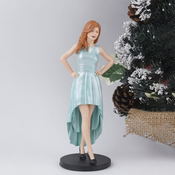 This 3D resin figurine radiates charm and sophistication, featuring a graceful woman dressed in a shimmering light turquoise high-low dress. Her confident pose, with hands on her hips, and her flowing curled hair add a sense of vitality and elegance to the piece.